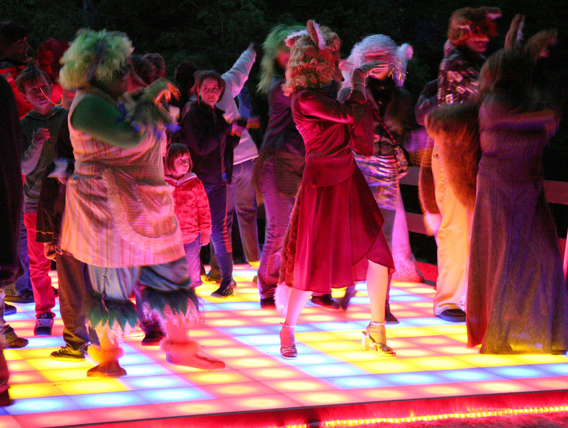SuperNature was an immersive public arts experience that fused 1970’s disco with a woodland setting to create a unique 2 day event. The audience were taken into a stunning woodland at dusk, through interactive installations, meeting disco themed animal characters and learning a sequence of funky dance moves. Finally the audience arrived at a nightclub entrance where they donned disco outfits and were lead to a spectacular full size solar powered dance floor deep in the woods.