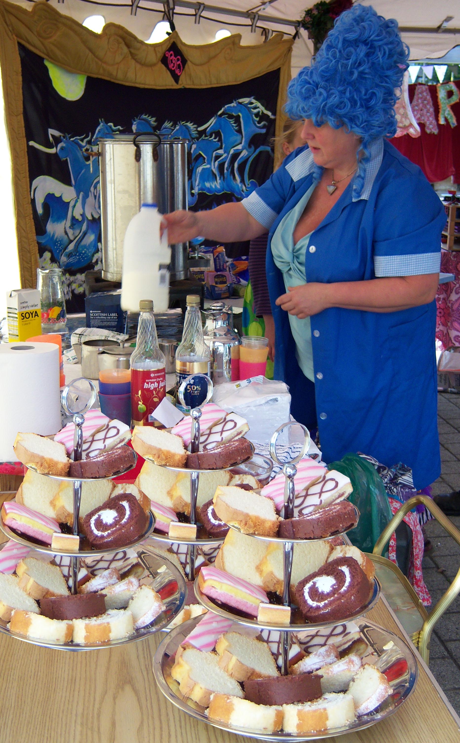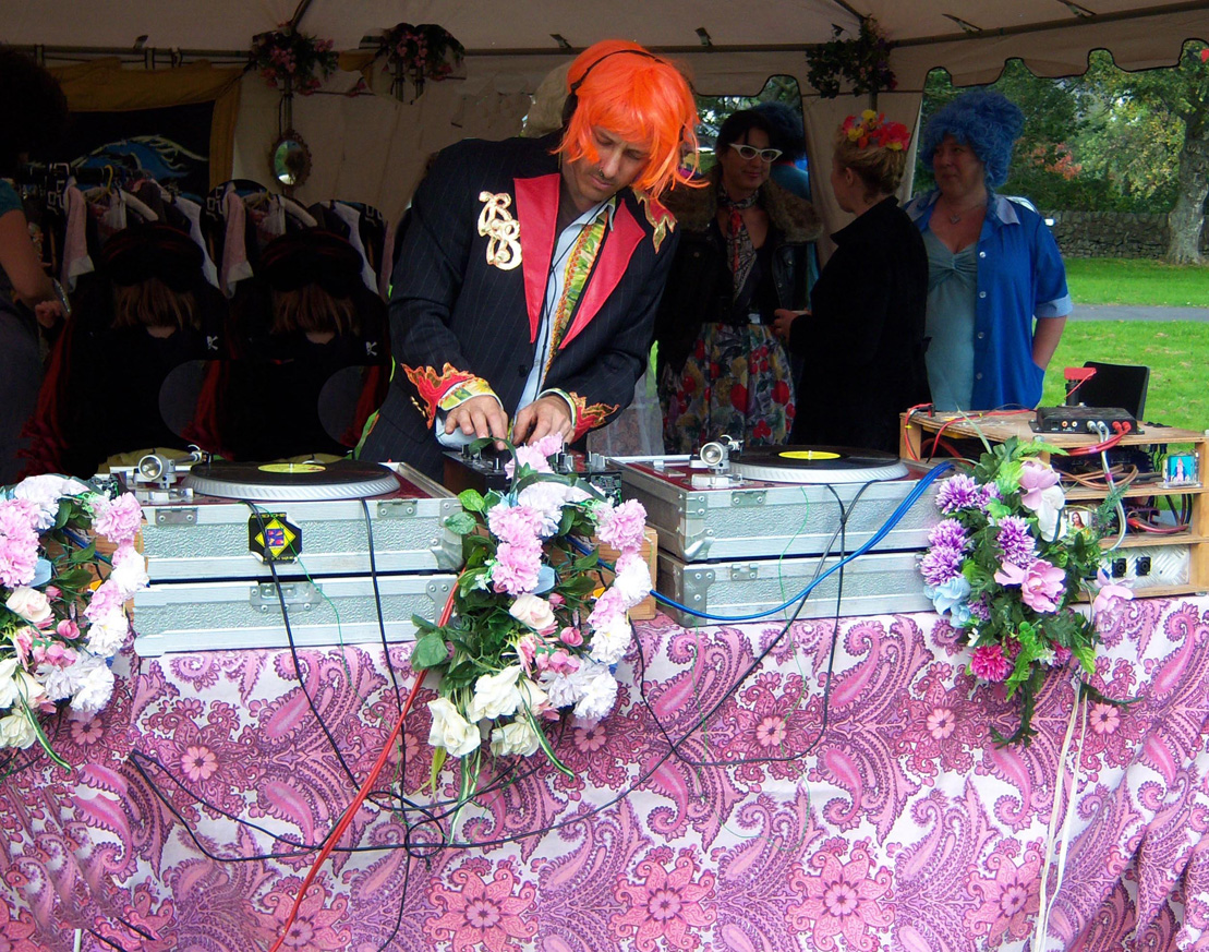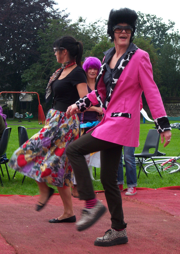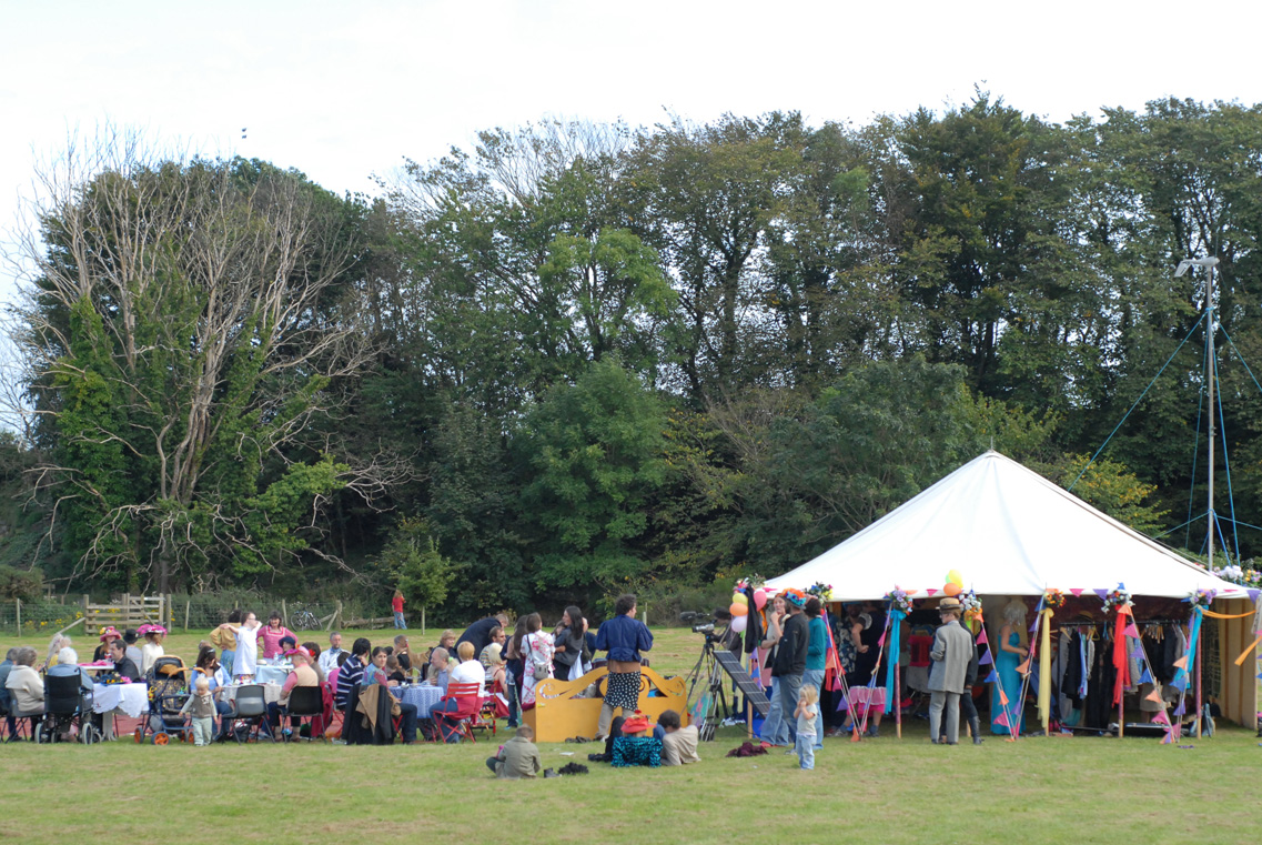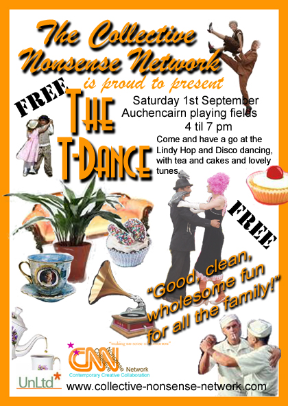 The Collective Nonsense team presented a fun reinterpretation of the 1950’s Tea Dance which toured local parks and playing fields. A finely decorated marquee sat by an outdoor dance area surrounded by tables and chairs complete with table cloths and waitress service. Traditional high teas were served (with classic cucumber sandwiches) while dance classes taught disco and lindy hop. Visitors made use of the huge boxes of dressing up clothes and wigs to create their own T-Dance characters while DJ Grubb entertained with fine afternoon tunes. The T-Dance was held in the Auchencairn, Creetown and Moniaive villages in Dumfries and Galloway, Scotland.